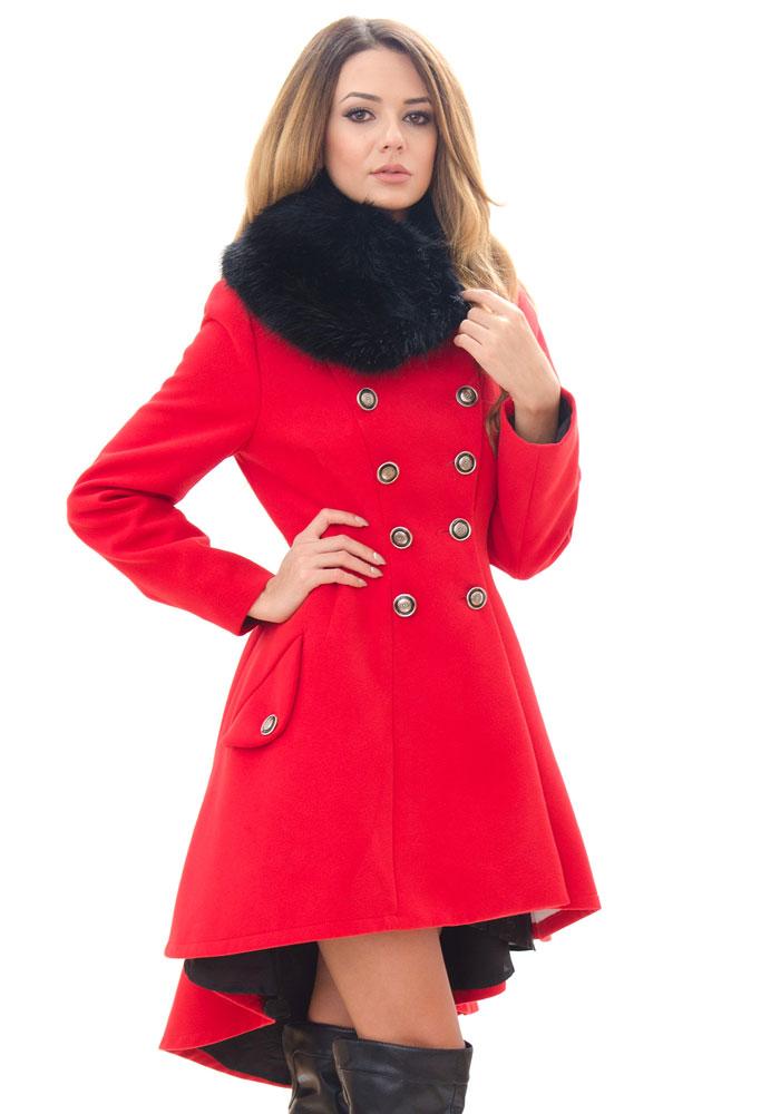 Дълго дамско палто в червено асиметрично със сваляема яка Radek's Collection